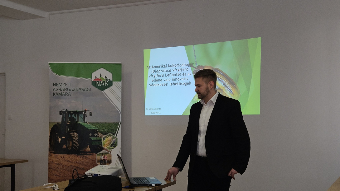 A programváltozás eredményeként az óvári Növénytudományi Tanszék szakembere, Vörös Levente kezdte a sort az amerikai kukoricabogár elleni növényvédelemről előadást tartva.